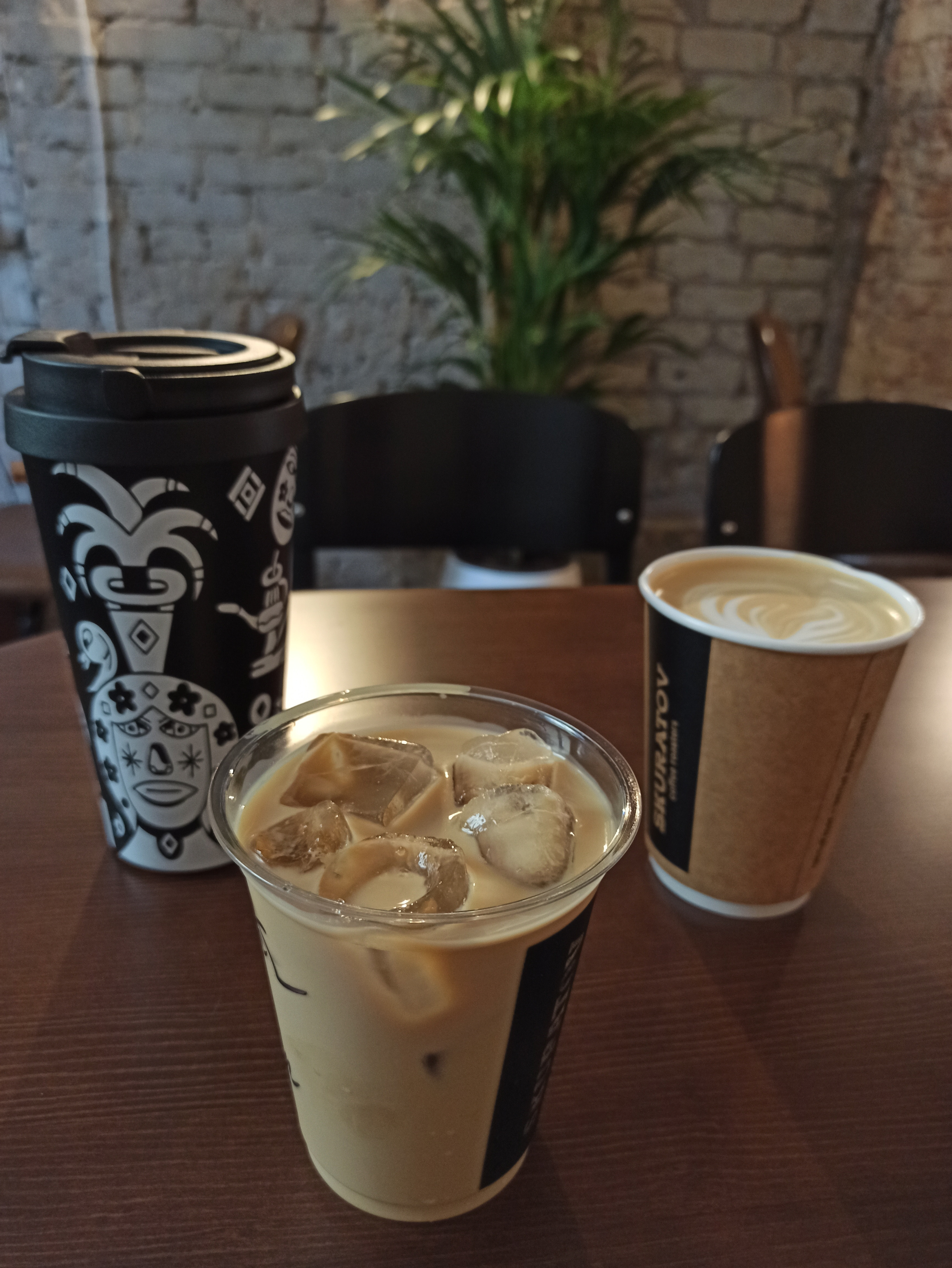 ☕ Приятным бонусом стала акция 1+1, напитки можно брать разные. Наш выбор пал на классический латте и холодный колд брю с молоком. Имейте ввиду, бариста отдает кофе без сахара. Его можно добавить по своему вкусу на отдельном столике. Там же найдете салфетки, соломинки, ложечки и пр. атрибутику.